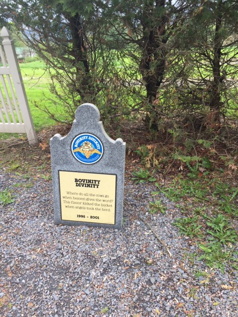 We also learned that 80% of the ice cream sold in the US by Ben & Jerry’s is manufactured by the company at this facility and another in Vermont. However, this factory has only one production line so can only make one flavor at a time. Today it was Half Baked, chocolate chip cookie dough and fudge brownies mixed into chocolate and vanilla ice cream. (No photos allowed on this part of the tour.) The third part of the tour was of course the part most people are most excited about: the free sample. There’s only one flavor offered a day. On our tour, it was Triple Caramel Chunk: caramel ice cream with a swirl of caramel and fudge-covered caramel chunks. It was sweet but tasty. We looked at buying another scoop of ice cream but decided to hold off, since we expected to be sampling a lot more nosh during the day. We did inquire about what was in the $50 Vermonster (not that we were going to order it). It was based on 20 scoops of ice cream, along with bananas, cookies, brownies, hot fudge and caramel, chopped walnuts, whipped cream, and four toppings!