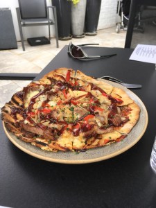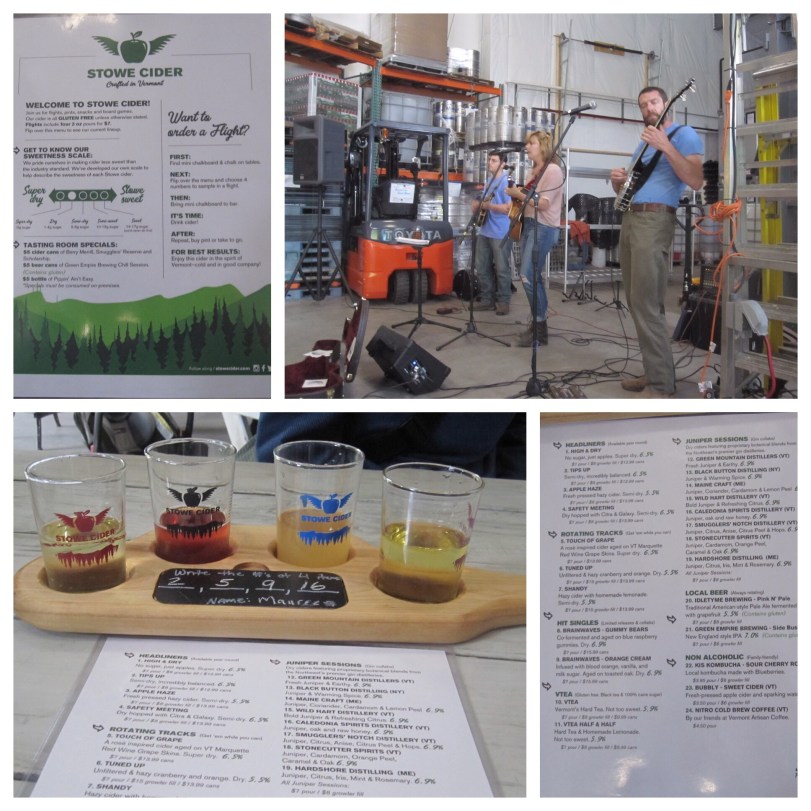 Our hostess Mary Anne had recommended that we check out Stowe Cider, noting that they would have live music on this Saturday evening. So we headed back up Mountain Road once again. Stowe Cider has a fantastic system for their tasting room. You get a little chalkboard, upon which you write your name and the numbers of 4 ciders you’d like to try from the menu. The bartender dispenses your ciders from numbered taps and serves them to you on a wooden carrier. We actually liked the gin collaboration that we tried. If I hadn’t been sharing with Maureen, I no doubt would have tried the gummy bear cider. The music was also great. Local artist Abby Sherman and her all-Vermont band entertained us with folk music for the duration of our visit. Of note, this place was very mellow and family-friendly, at least in 4-5 p.m. time frame.