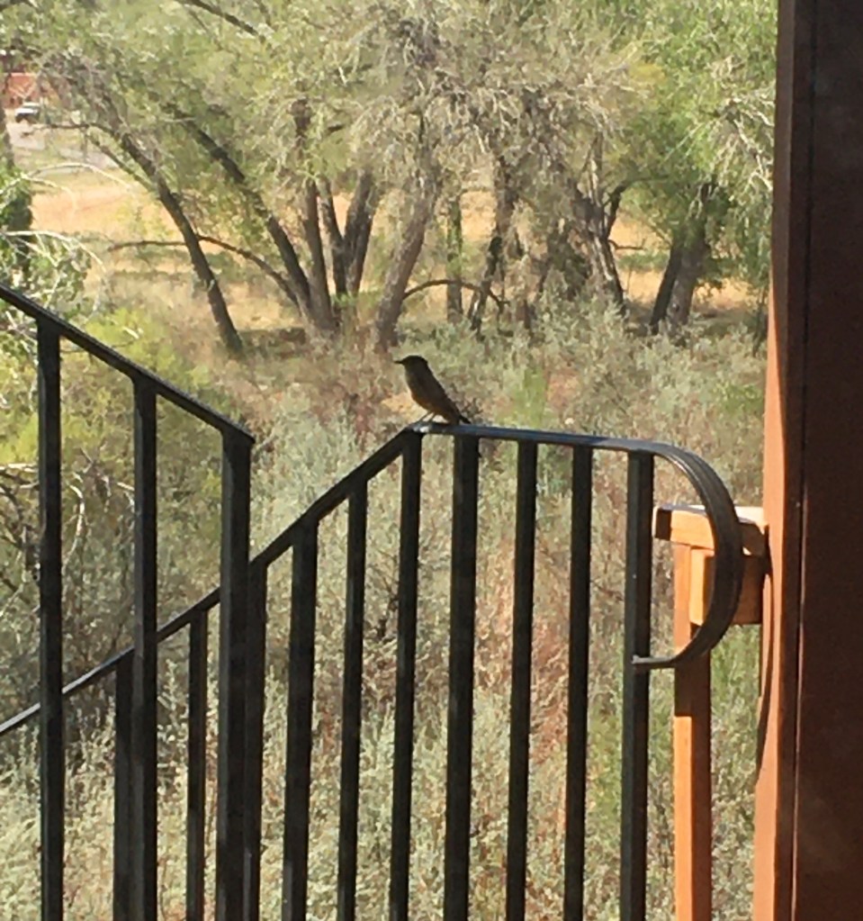 This is one of our local Say’s phoebes. They usually hang out in the trees or by our neighbor’s deck, but today this one visited our deck. Notice how green everything is. Those who live here know that’s a very transient state. (Enjoy it while it lasts.)