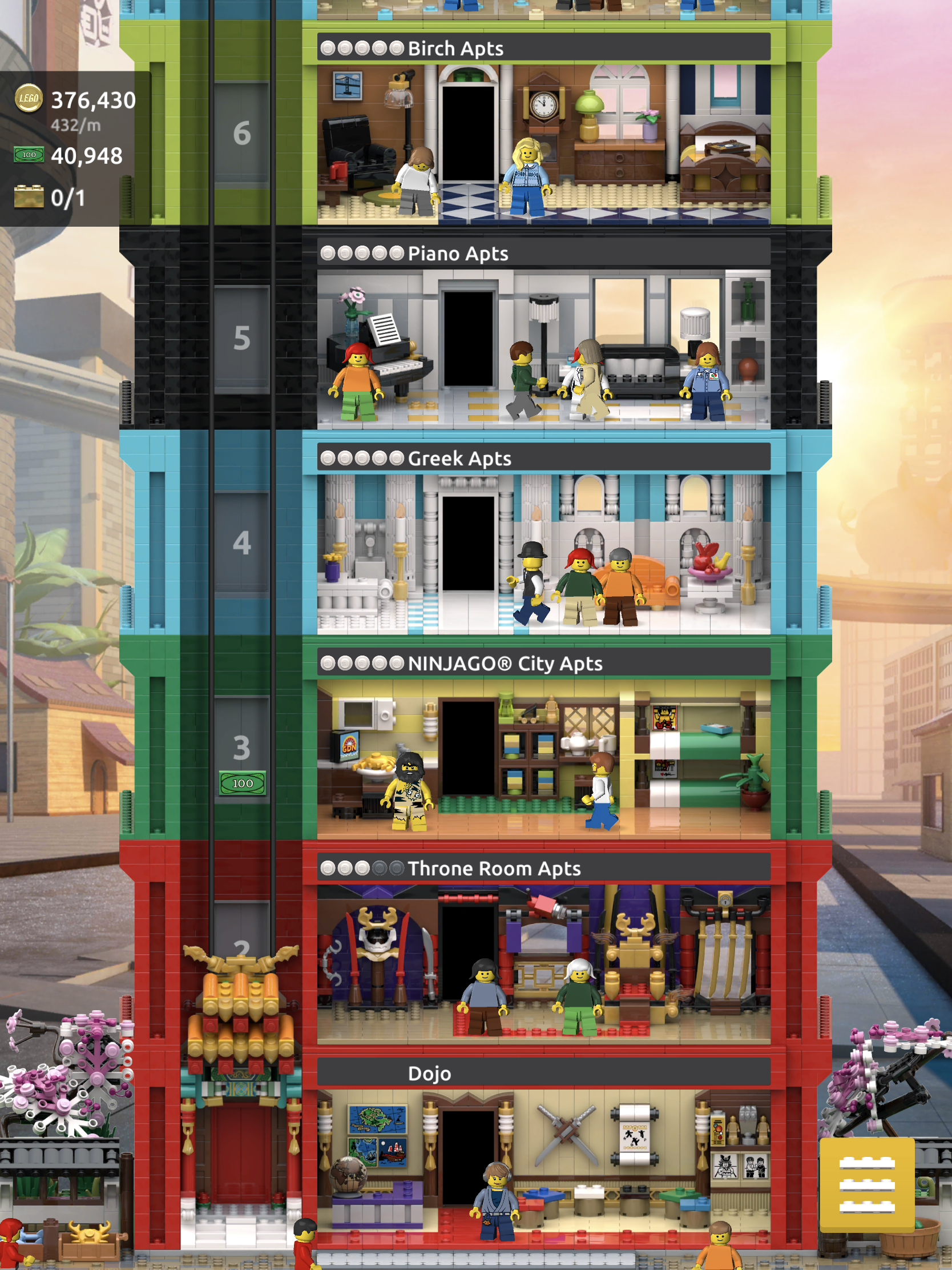 I also continued my journey with the LEGO Tower game. I’m enjoying it, but I would like a few more adult options to build—fancy cocktail bar, yoga studio, Apple store, Irish pub, travel agent. It’s also almost relentlessly positive (not a bad thing in pandemic times) since no one fights or gets fired or takes away your earnings. There is that underlying capitalistic motive though, since your goals are to earn coins and bux and continuously expand your tower. At least putting people in their dream jobs is also quite lucrative.