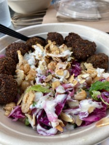 We didn’t have much energy for dinner that evening, so we opted to try one of niece’s local recommendations: Taïm. This small chain serves mostly vegetarian Mediterranean food in pitas and bowls. I had the Greek salad—with more Kalamata olives than I’ve ever seen served at one time, but I think Maureen made the better choice with the falafel bowl. I can attest that the falafel were delicious.